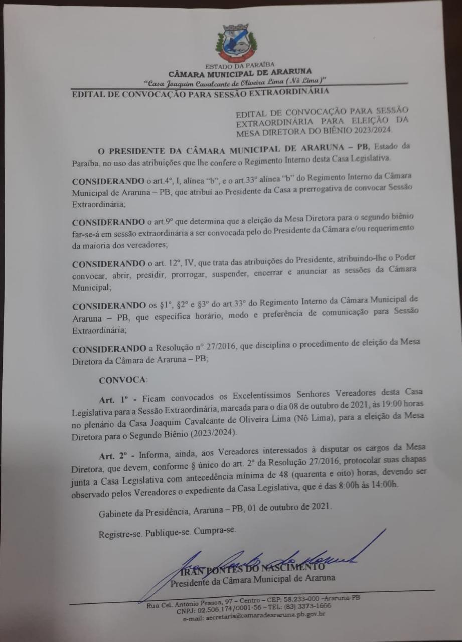Convocação para Sessão Extraordinária 2023-2024